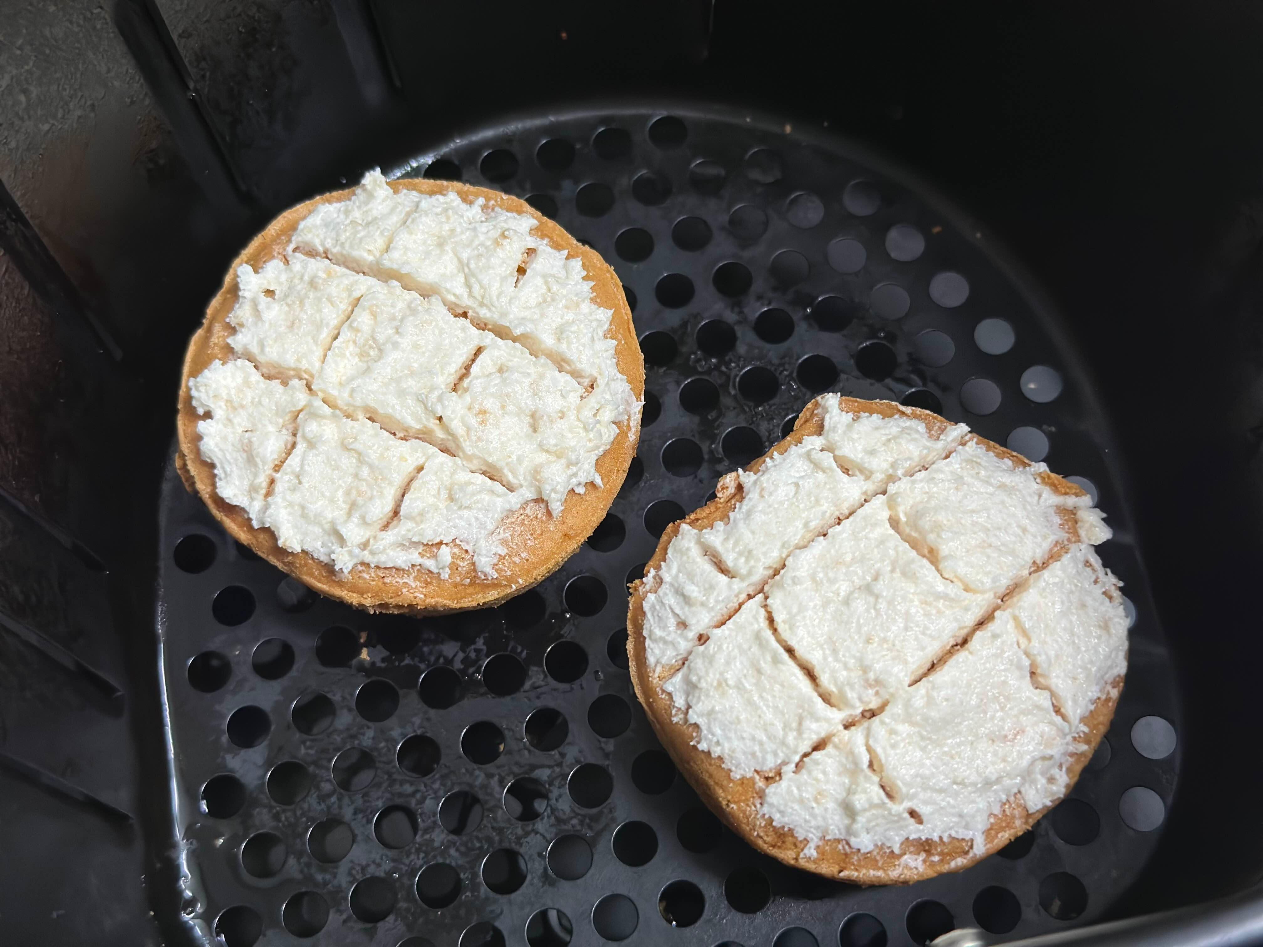 오리온 카스타드의 칼디 메론짱 스프레드를 발라 에어프라이어에 180도에서 5분 구우면 완성.